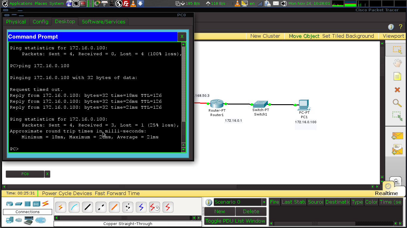 12. nahhh setelah smua telah di setting waktunya kita test ping dari pc0 ke pc1